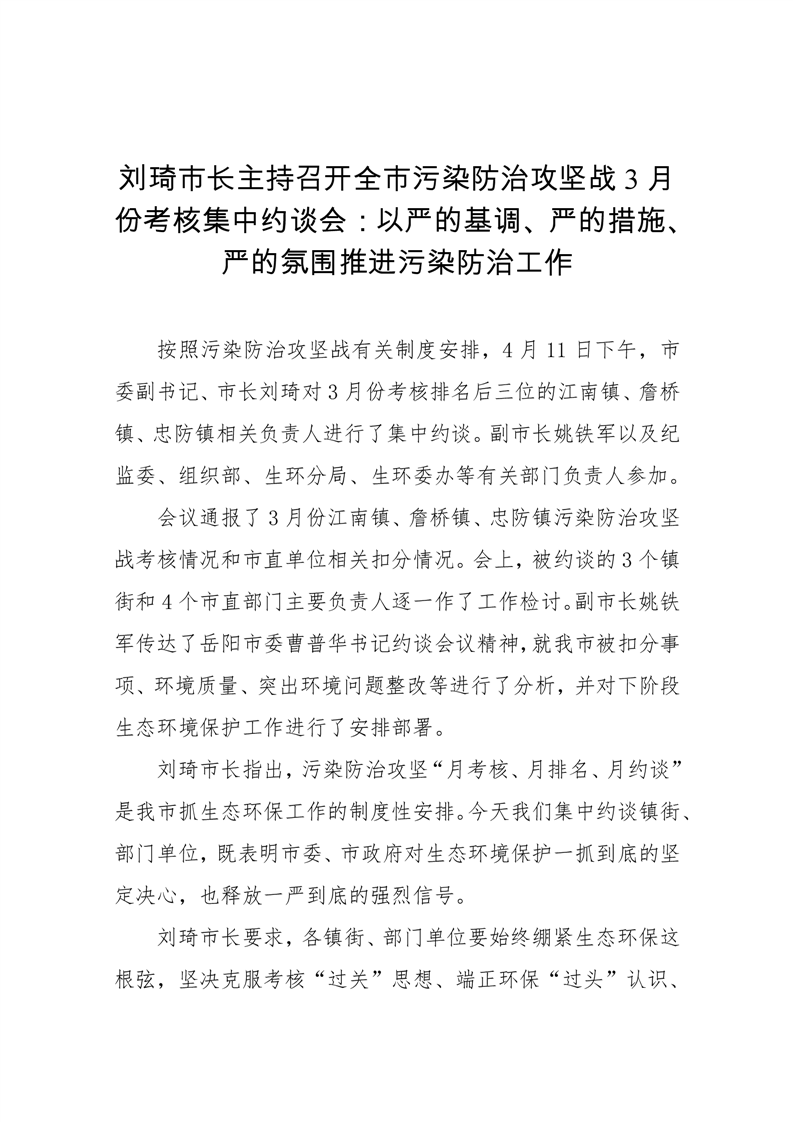 刘琦市长主持召开全市污染防治攻坚战3月份考核集中约谈会:以严的基调、严的措施、严的氛围推进污染防治工作