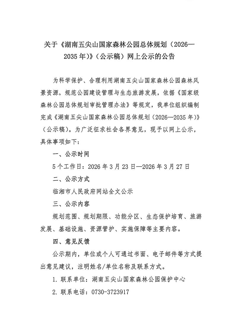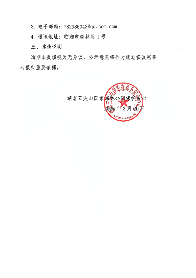关于湖南五尖山国家森林公园总体规划2026-2035年公示稿网上公示的公告