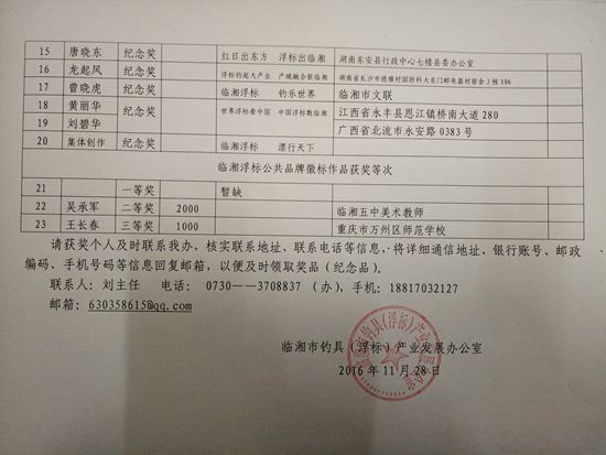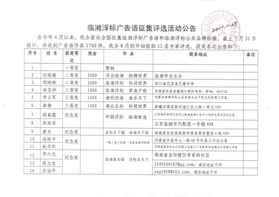 自今年4月以来,我办面向全国征集临湘浮标广告语和临湘浮标公共品牌标徽。截止7月31日统计,共收到广告语作品1700件,徽标作品20件。我办从8月初至11月初组织11名专家进行评选。获奖等次详见附表。