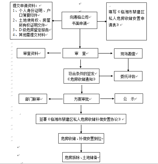(一)申请。由危房所有权人向岳阳惠临公司提出收储安置书面申请。申请材料应附:1、《临湘市禁建区私人危房收储安置申请审批表》,由所在村、组、居委会、街道办事处签字同意后申报;2、个人身份证明和户口簿复印件;3、《房屋所有权证》、《土地使用证》;4、经房屋安全鉴定机构签署的D级危险房屋的鉴定报告;5、需提交的其他材料。