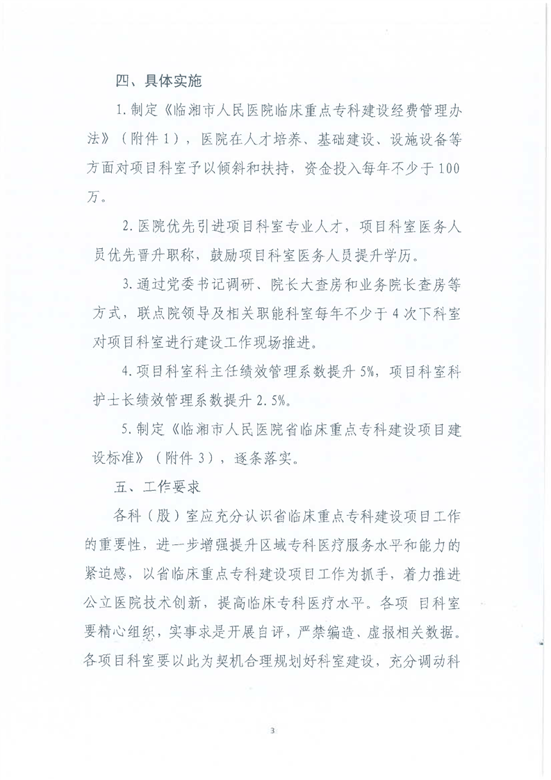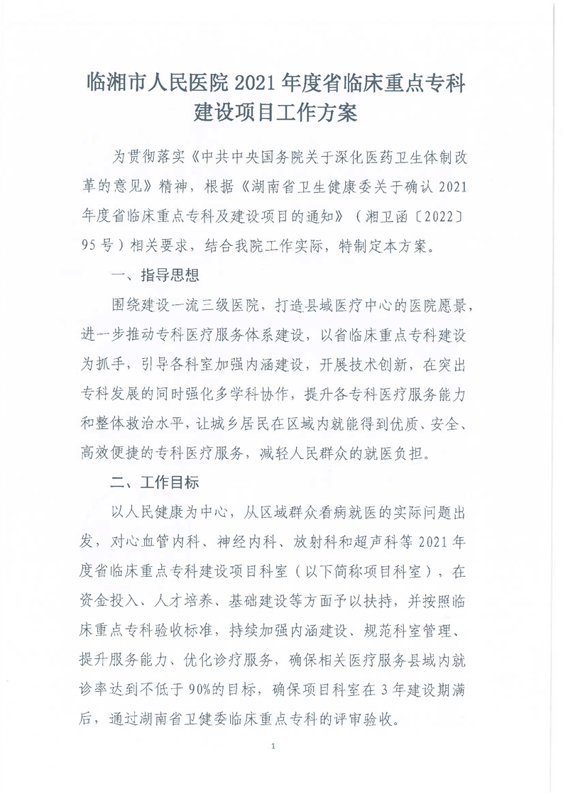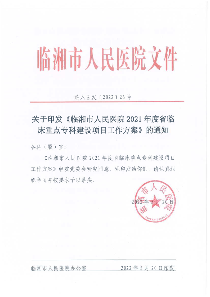 关于印发《临湘市人民医院2021年度省临床重点专科建设项目工作方案》的通知