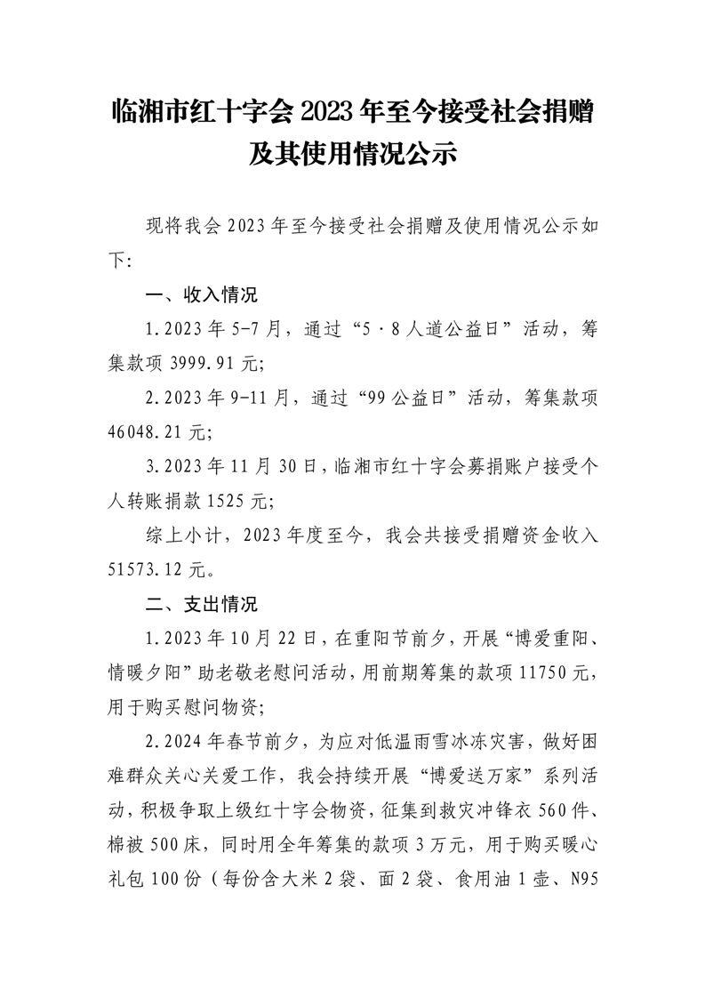 临湘市红十字会2023年至今接受社会捐赠及其使用情况公示