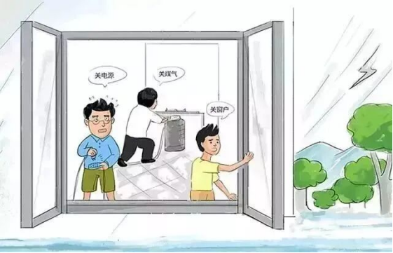 暴雨来临,关闭门窗,防止雨水扑入屋内,一旦进水立即关闭电源、煤气等设备。