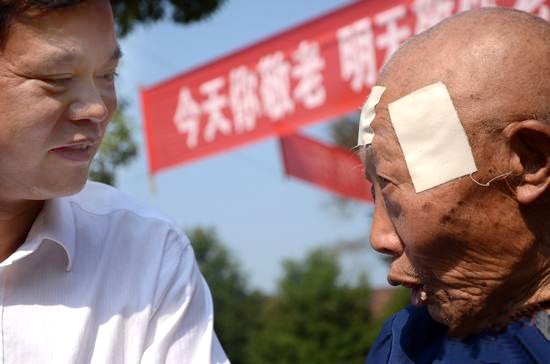 图为全国道德模范李国武和他认养的老人李仲生一起切蛋糕