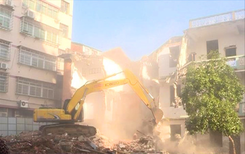 拆除现场,工作人员疏散群众,拉起警戒线,疏导指挥交通。拆除利用挖掘机进行作业,拆除同时还配备洒水车洒水,抑止扬尘。在挖掘机的轰鸣声中,目标建筑在当天全部拆除到位。