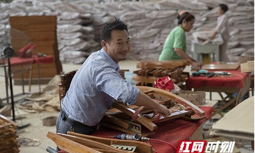 在羊楼司镇的工厂里,工人们正在埋头制作竹器。