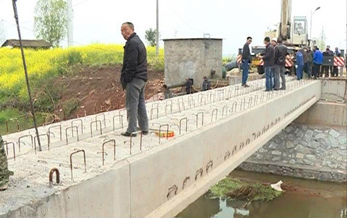 交通运输局总工程师郑辉说:目前,这座桥已经吊装了三片桥梁,预计今天上午5片桥梁将会安全吊装完毕,这个桥面铺装大概要半个月的时间,4月中旬这座桥将会顺利通车。2017年我市交通局向上争取了35座危桥改造计划,帮助老百姓解决通行问题,让老百姓走上安全、放心桥。