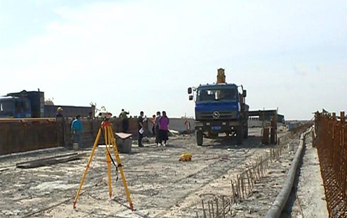 在临港公路一期白云大桥建设工地的施工现场可以看到,为了加快工程的进度,工人们正在进行紧张的施工,两位工人正