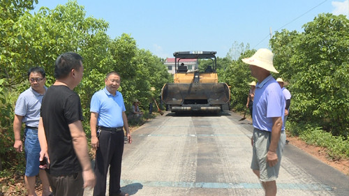 在坦渡镇定湖村公路“白改黑”施工现场 ,一片繁忙景象。特种机械在村级公路上浇筑沥清,压路机正对刚铺好的沥清路面来回碾压,柏油路面让乡村面貌焕然一新。