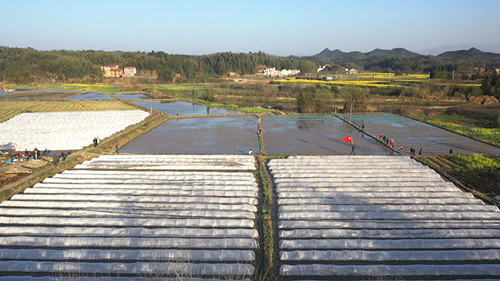 在五里牌街道楠木村种粮大户方志明的早稻集中育秧点,村民们正在农技人员的指导下,忙着整平秧床、抛撒谷种、撒施肥料、覆盖薄膜,田间地头一派繁忙景象。
