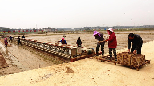 走进聂市镇早稻集中育秧示范点,一台自走式播种机有条不紊的运行着,工作人员将第一批已冒出嫩芽的秧苗盘通过输送带送到田间,摆盘、插竹架、盖薄膜等工序有序开展。