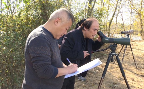在保护区内,工作人员用望远镜、相机等装备观察远处湖内的候鸟,并记录下各种候鸟的数量、种类和活动规律,为湿地保护提供科学依据。