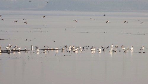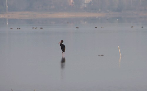眼下正值候鸟迁徙季,有大批候鸟飞到我市黄盖湖自然保护区,其中有7只黑鹳在鸟群中特别显眼。