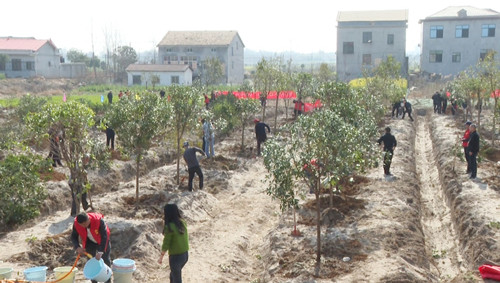 在长江岸线临湘段,200余名干群、志愿者来到江南镇灯塔村进行义务植树。大家相互配合,扶正新苗、挥锹填土、踩实压紧,共栽植近千株红叶石楠、桂花、女贞树苗,为长江之滨增添了一道新绿。