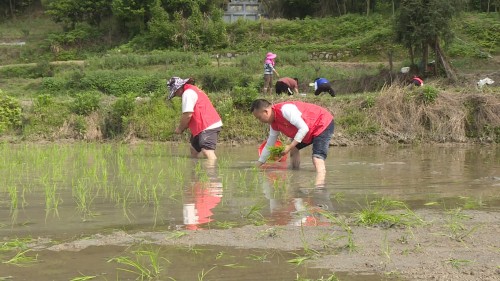 农业种植知识培训后,党员干部们集体“扎”进水田里开始忙活了起来。大家撸起袖子、挽起裤脚、脚踩泥土,移秧、抛秧,相互配合。经过2个多小时的劳作,“责任田”披上了“绿装”。