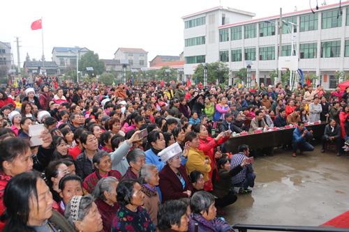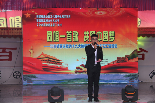 10月18日,江南镇长江村文化活动广场上人头攒动,热闹非凡,该镇举办的“同唱一首歌 共筑中国梦”喜迎党的十九大胜利召开群众文艺汇演在此欢乐上演。