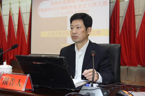 岳阳市委讲师团主任、教授戴文慧应邀作辅导报告。报告以《夺取新时代中国特色社会主义伟大胜利》为题,从十九大盛况、十九大报告的主要精神、十九大的新亮点三个方面,对十九大会议精神进行了全面解读,对党的十九大提出的新思想、新观点、新论断,作出了系统阐述,以丰富的事例、深刻的理论,引经据典、深入浅出,为参会者贡献了一场精神盛宴。