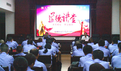 听道德模范讲故事,谈人生感悟。8月24日,市食品药品工商质量监督管理局全体干部职工认真聆听第四届全国道德模范李国武宣讲的道德课。