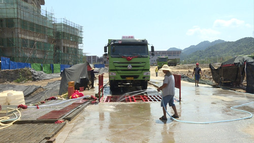 这款新型渣土车覆盖装置为电动折叠顶盖,全自动密闭,避免了老式渣土车带来的密封不严、抛撒滴漏等弊端。同时,施工现场还专门配备车辆冲洗设备,车辆驶离工地前,由清洁人员冲洗车辆,确保渣土车上的泥土全部冲掉后才上路,防止尘土、脏水污染路面。