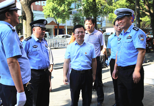 9月29日上午,市委书记谢胜带队就国庆期间安保维稳和节日氛围营造工作进行督导检查,向工作在一线的公安民(辅)警和交通、环卫等战线干群致以节日的问候和衷心的感谢。谢胜强调,要时刻绷紧安保维稳这根弦,严格落实各项工作措施,全力以赴加强安全防范,为人民群众欢度节日营造一个平安、稳定、祥和的社会环境。市委常委、市委办主任孙少游,市政府副市长、市公安局局长邓可杰等参加。