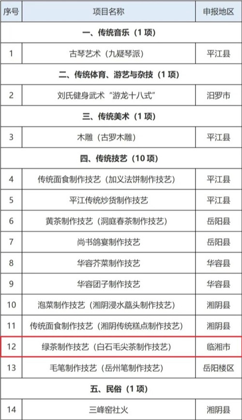 近日,岳阳市人民政府公布了岳阳市第六批市级非物质文化遗产代表性项目名录,我市申报的绿茶制作技艺(白石毛尖茶制作技艺)被列入岳阳市第六批市级非物质文化遗产代表性项目名录。