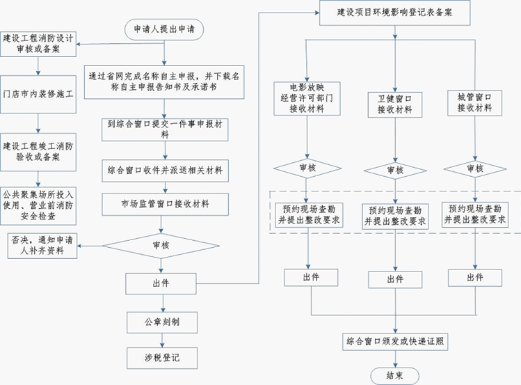 营业执照2个工作日,电影放映经营许可证9个工作日,公共场所卫生许可证7个工作日,户外广告许可证5个工作日,临时占用街道两侧和公共场地许可证5个工作日,建设工程消防设计审核或备案7个工作日,公众聚集场所投入使用、营业前消防安全检查合格证8个工作日,税务事项办理可即时办结。不符合相关情形,或涉及增值税专用发票(增值税税控系统)最高开票限额审批且最高开票限额十万元以上的最多需要20个工作日。