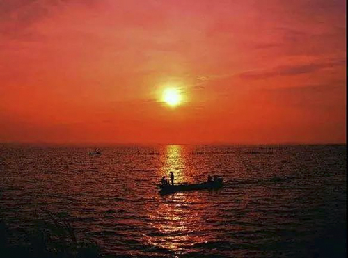走近湖岸,但见水面宁静,岸线开阔。湖水浩浩汤汤,一望无际。岸边有荷、芦苇、菖蒲点缀,还有悠闲吃草的水牛。不时有两三只白鹭掠过水面,成群的鱼鹰聚集在一起,伺机搜寻它们的美食。
