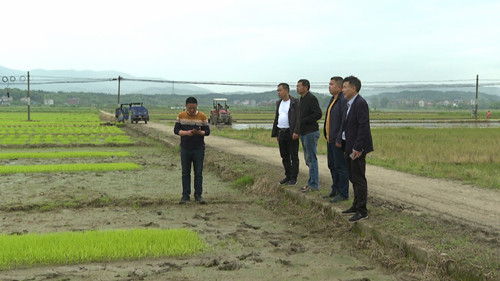 在长塘镇水圳村,市农业农村局科技特派员李一波等人正在为农户传授水稻种植技巧。