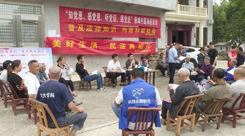 在雁峰村晓峰屋场,村民们围坐在一起,忠防法庭负责人通过通俗易懂的语言,讲解了《民法典》的制定过程和重大意义,并针对群众法治需求和关注的热点问题,结合典型案例以案释法,引导村民们学会运用法律途径处理民事纠纷、维护自身权益。