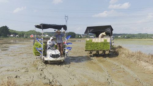 五里牌街道楠木村种粮大户方乐军:“我们4台插秧机同时作业,一天能插秧120亩田左右,相比传统人工插秧,效率提高了很多。我这里目前剩余农田400多亩,预计可在三天内插完。”