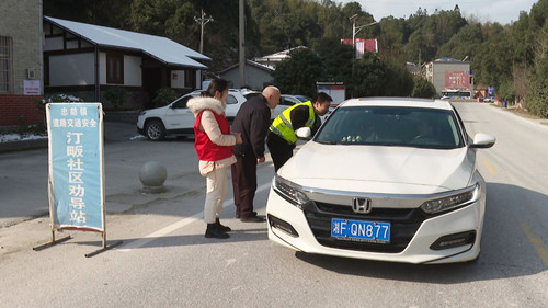 在忠防镇汀畈社区,志愿者们在重点路口、路段设立卡点,对过往车辆超员超载、违法载人、不戴安全头盔等交通违法行为进行检查、纠正和查处,并结合典型事故案例,为驾乘人员耐心讲解道路交通法律法规和冬季出行注意事项等交通安全知识,督促大家遵法守规、文明出行。
