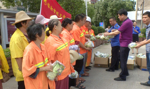 7月12日上午,市环卫中心党总支开展“送清凉”活动,为高温下坚守岗位的环卫工人送去清凉和关爱。