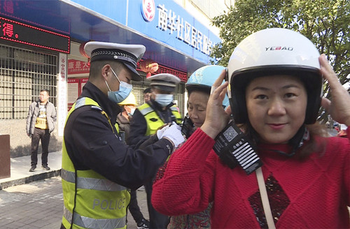 云湖街道南华社区居民付丽容:“我是这里附近的居民,今天经过这里,看到这个免费送安全头盔活动,我就领了一个头盔,以后大家在安全行驶的途中,一定要记得佩戴好安全头盔。”