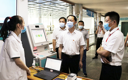 王文华一行先后来到长安汽车站、市人民医院、平安蓝天大药房、临湘火车站、长河医院等地,听取相关负责人防疫工作情况汇报,了解核酸检测能力,翻阅防控登记台账,实地查看从业人员和市民佩戴口罩、查验健康码、测温、登记等防控措施落实情况。