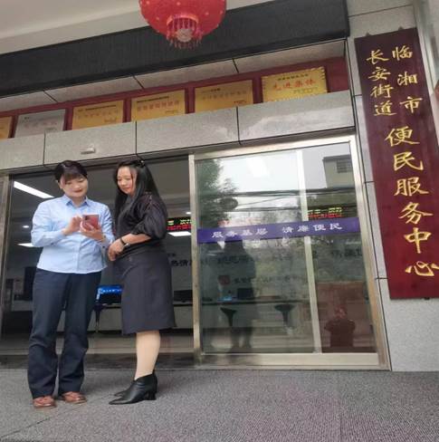 长安便民中心工作人员下乡手把手教群众在湘易办上了解项目商机,惠民政策。