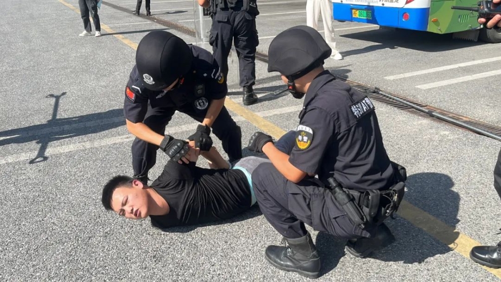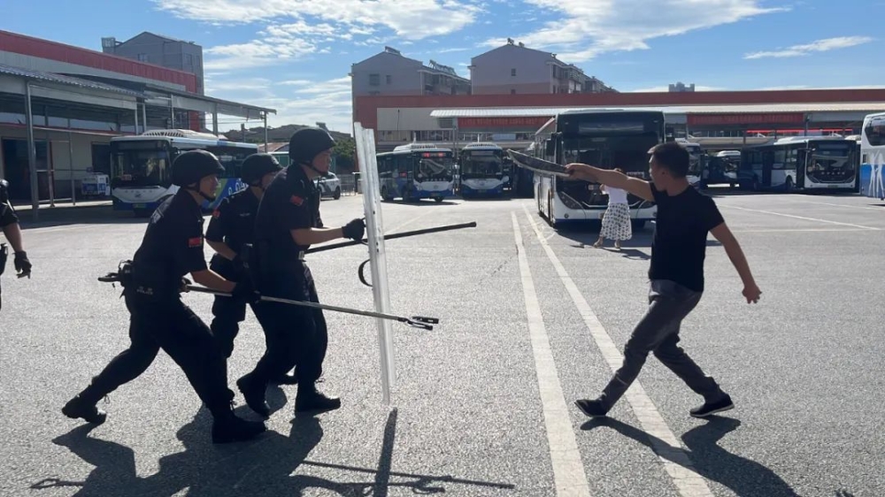 演练模拟一名醉酒乘客拒不支付车费与司乘人员发生争执,并持刀与警方对抗的情景。巡特警大队在接到110派警后,迅速启动应急预案,队员们根据分工,迅速控制现场秩序,疏散围观群众,采取三角站位接近滋事人员,并用叉、棍对其实施袭扰,待该人员走神之际持盾迅速出击,成功制服滋事人员。整个演练场面逼真、紧张有序、快而不乱,参演民辅警反应迅速,展现出过硬的战斗素质、心理素质和应急处置实战能力。
