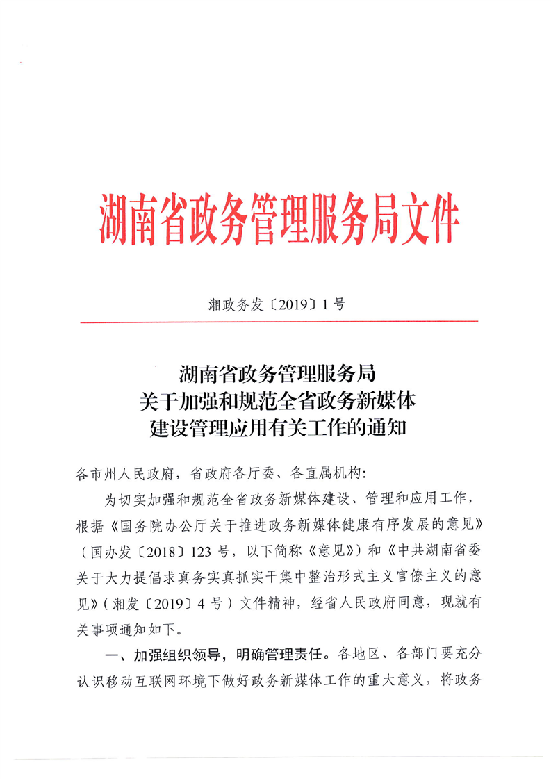 湘政务发〔2019〕1号-关于加强和规范全省政务新媒体建设管理应用有关工作的通知