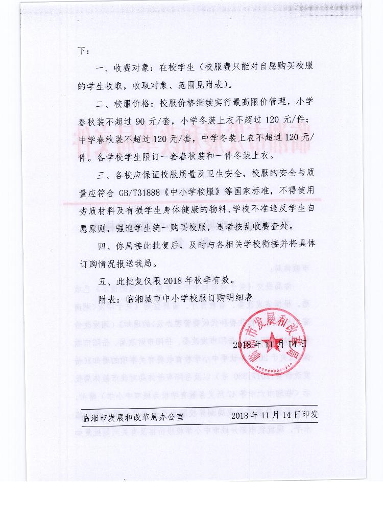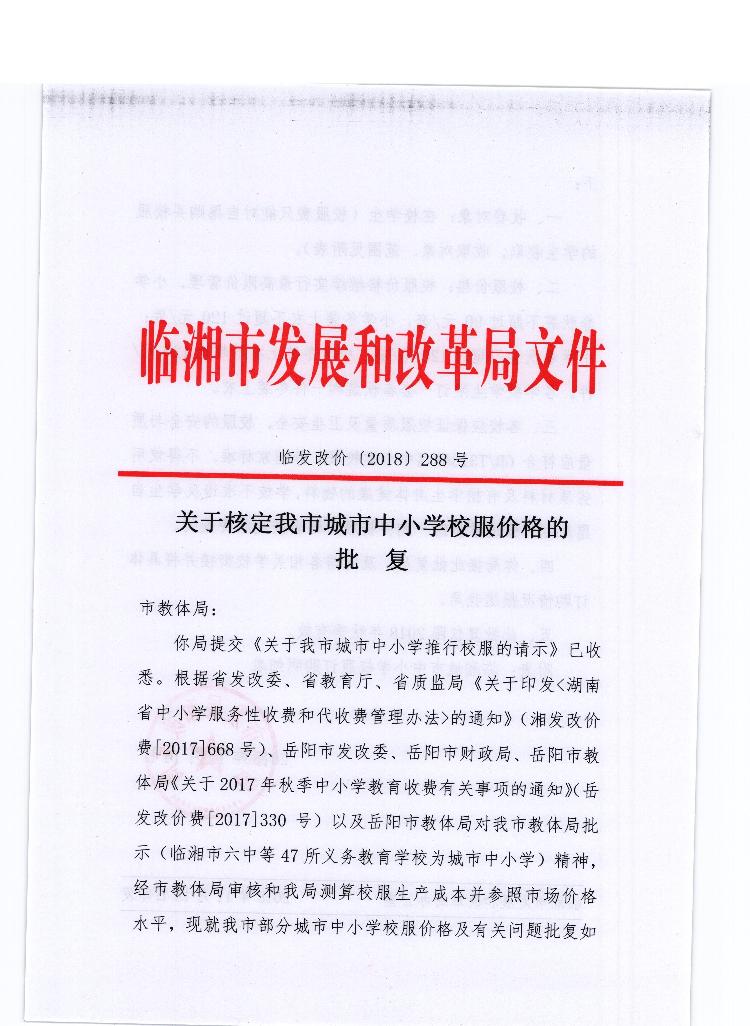 关于核定我市城市中小学校服价格的批复
