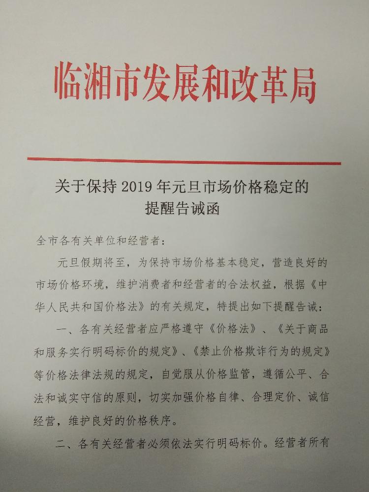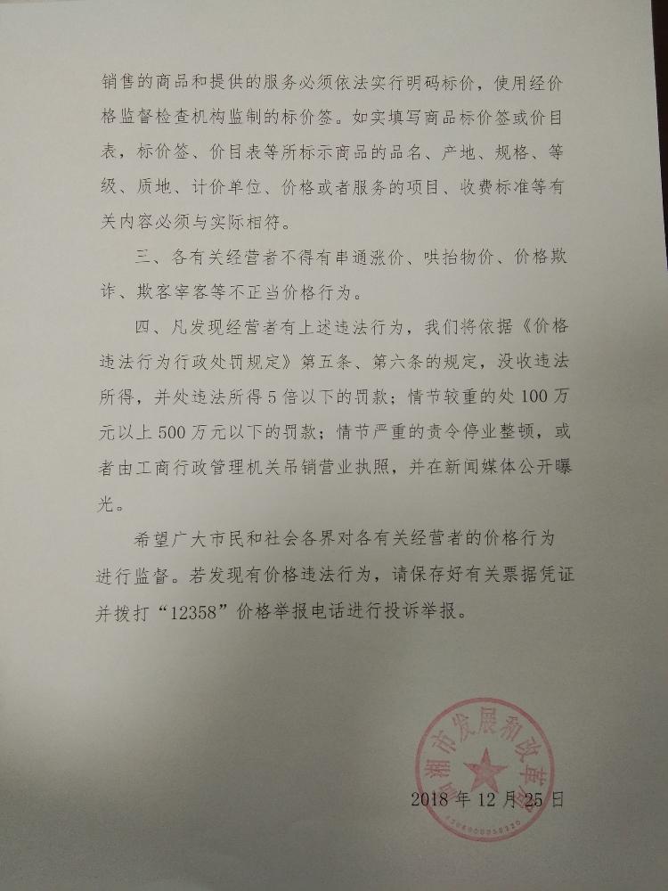 关于保持2019年元旦市场价格稳定的提醒告诫函