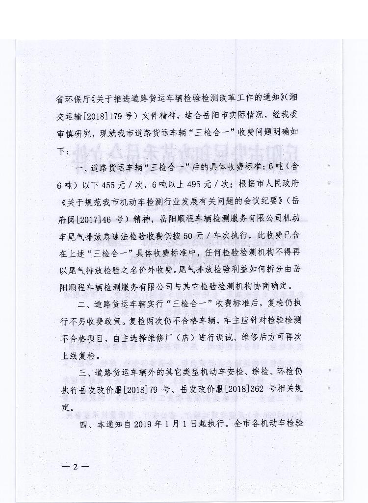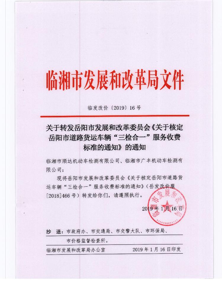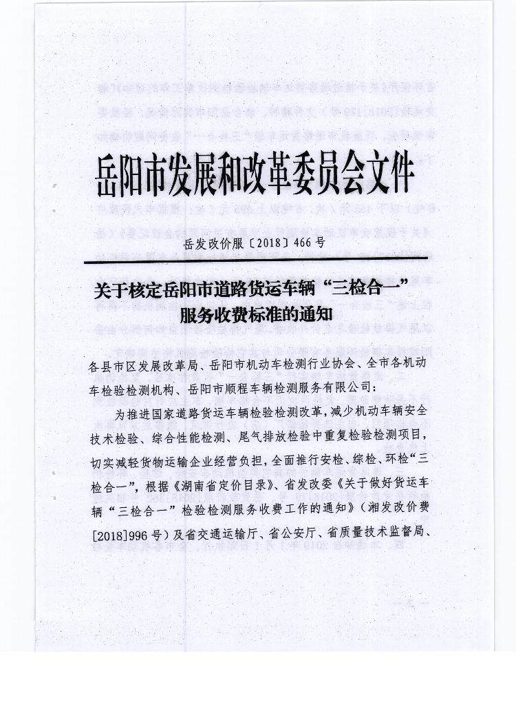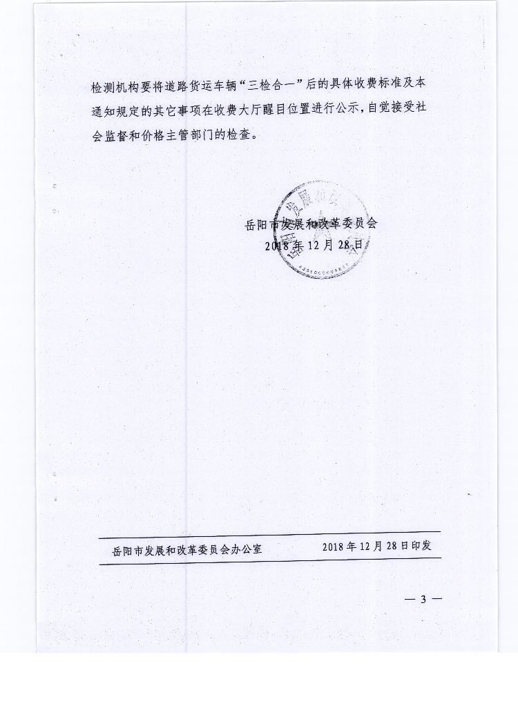 关于转发岳阳市发展和改革委员会《关于核定岳阳市道路货运车辆“三检合一”服务收费标准的通知》的通知