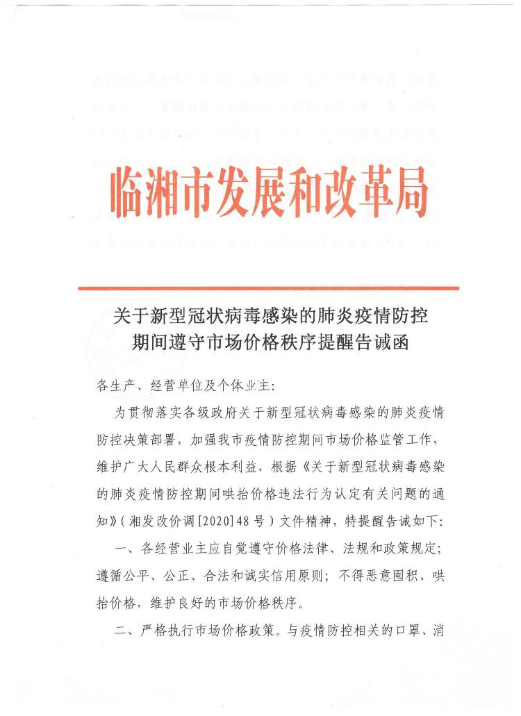 关于新型冠状病毒感染的肺炎疫情防控期间遵守市场价格秩序提醒告诫函