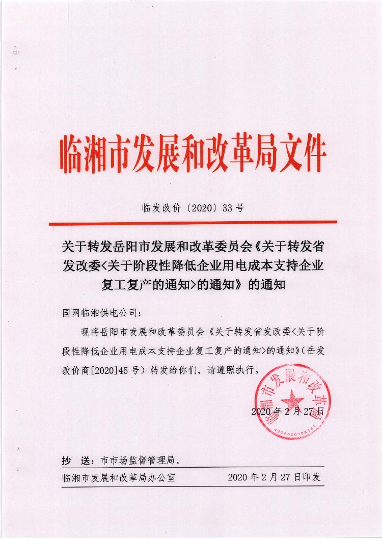 关于转发岳阳市发展和改革委员会《关于转发省发改委关于阶段性降低企业用电成本支持企业复工复产的通知的通知》的通知
