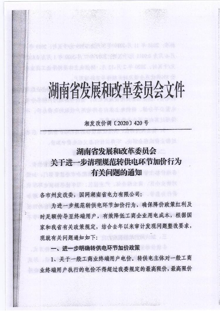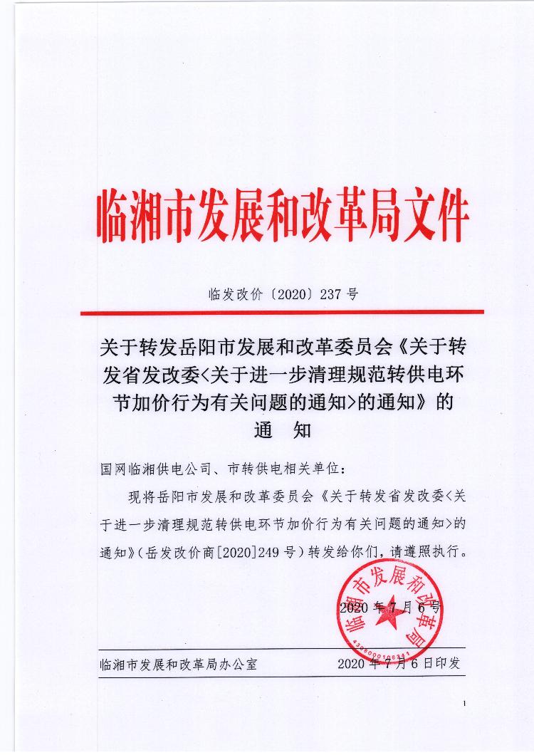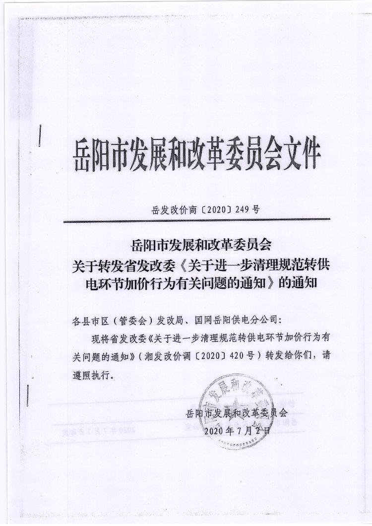 关于转发岳阳市发展和改革委员会《关于转发省发改委关于进一步清理规范转供电环节加价行为有关问题的通知的通知》的通知