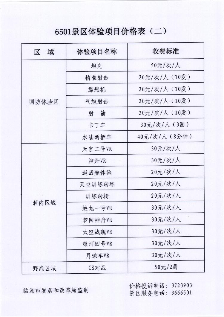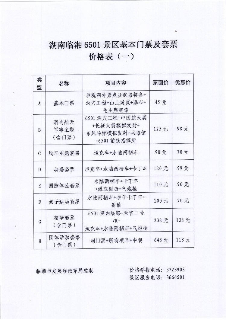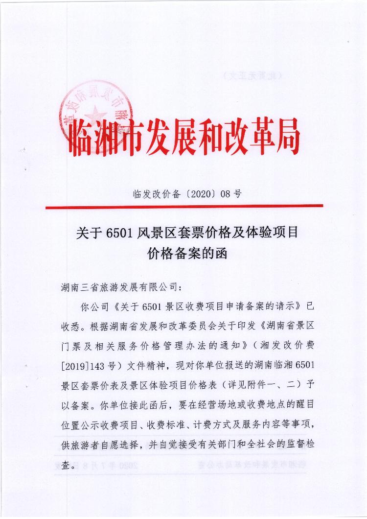 关于6501风景区套票价格及体验项目价格备案的函