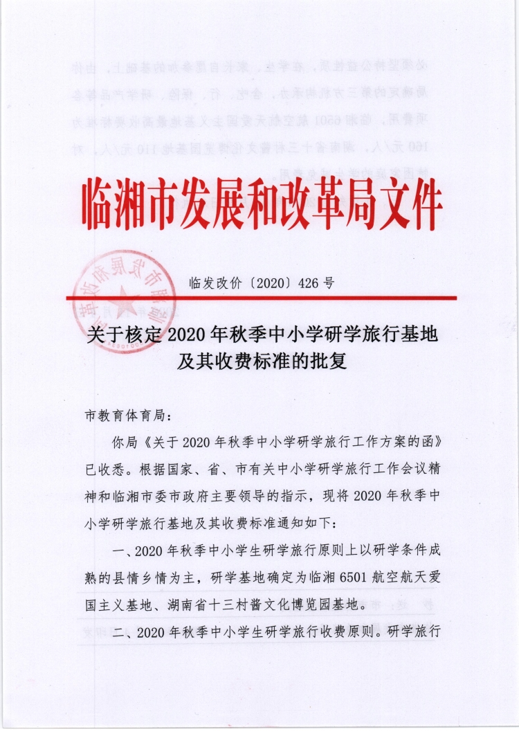 关于核定2020年秋季中小学研学旅行基地及其收费标准的批复