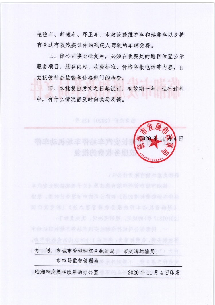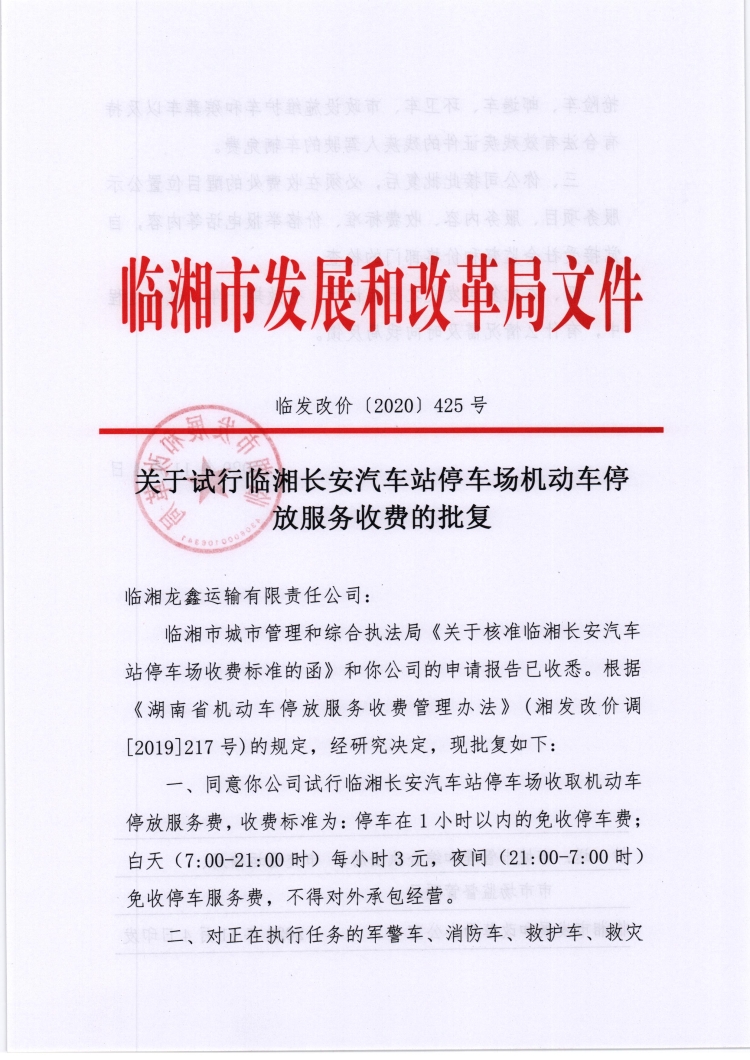 关于试行临湘长安汽车站停车场机动车停放服务收费的批复