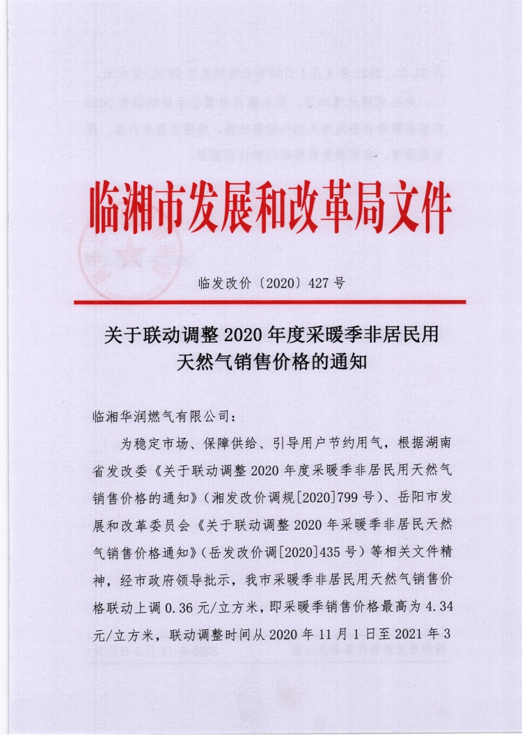 关于联动调整2020年度采暖季非居民用天然气销售价格的通知