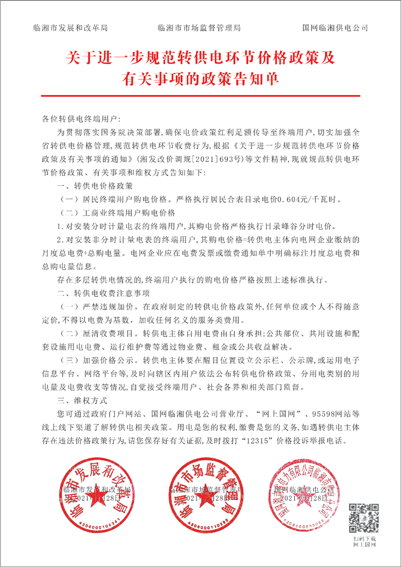 关于进一步规范转供电环节价格政策及有关事项的政策告知单