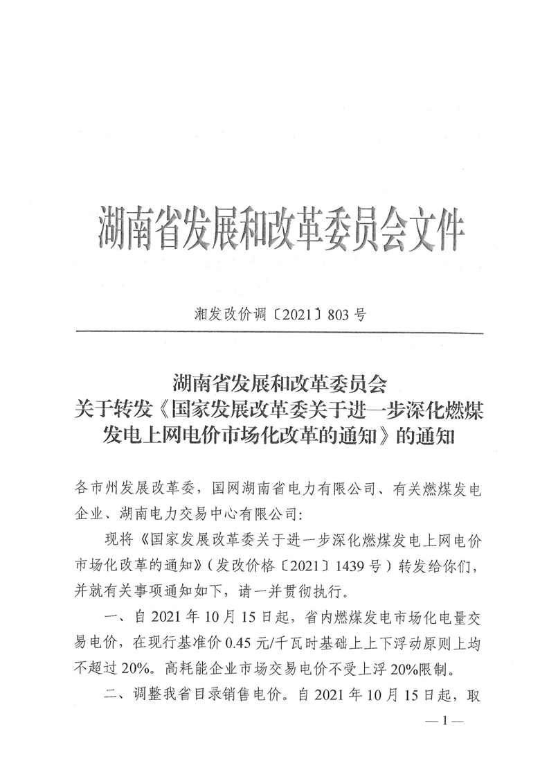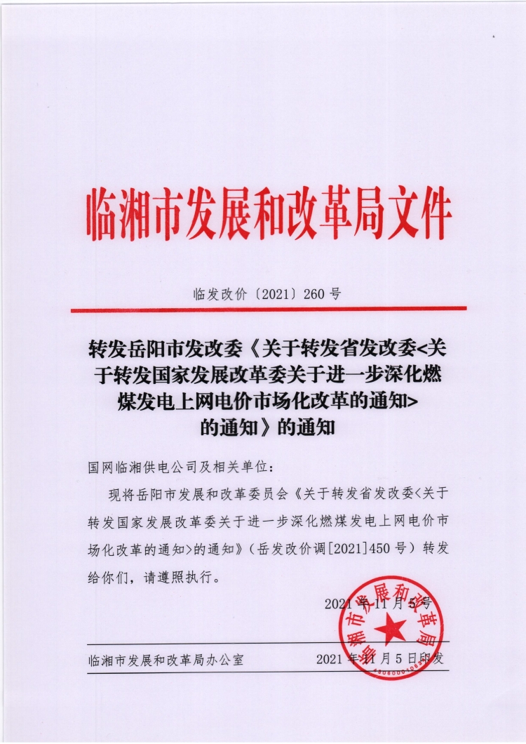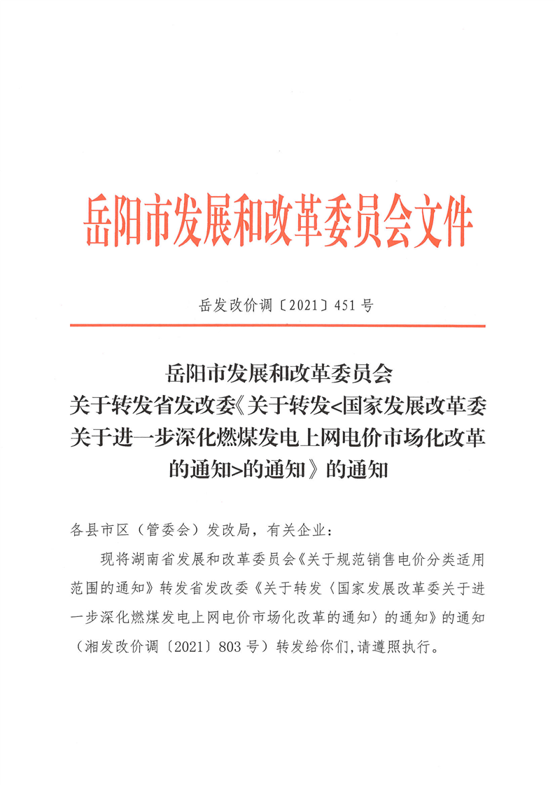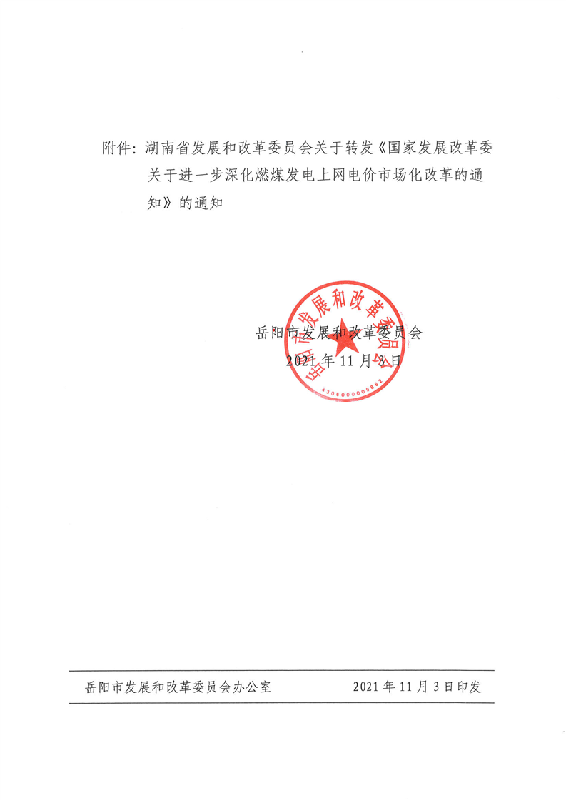 转发岳阳市发改委《关于转发省发改委关于转发国家发展改革委关于进一步深化燃煤发电上网电价市场化改革的通知的通知》的通知
