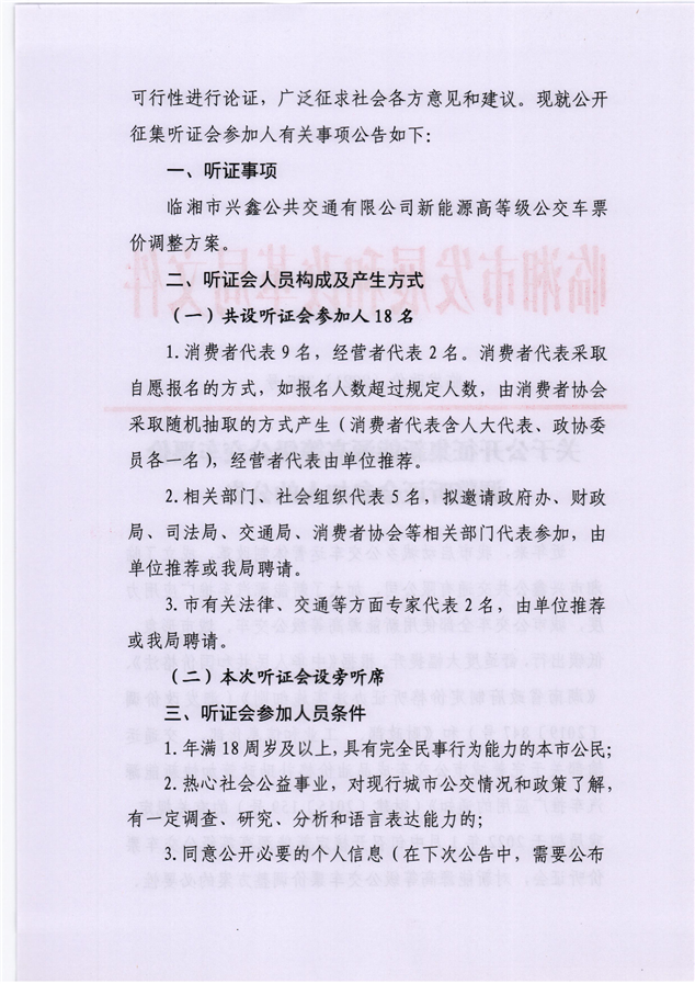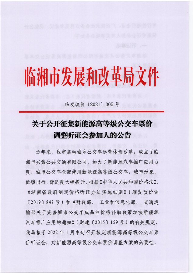关于公开征集新能源高等级公交车票价调整听证会参加人的公告